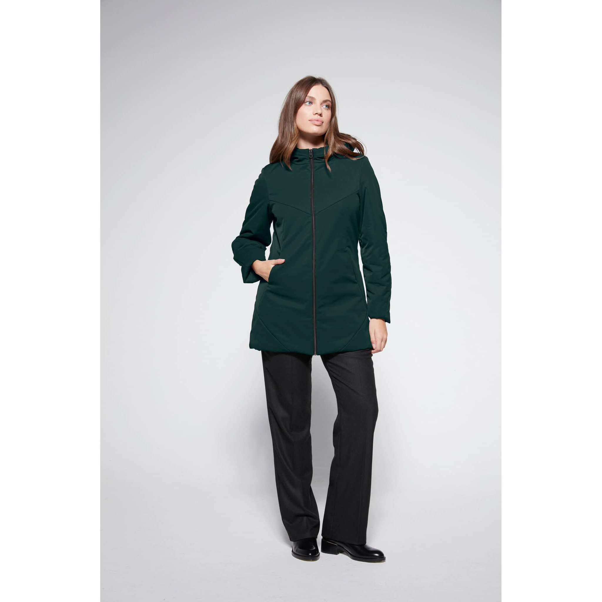 Giubbino donna con cappuccio fisso in tessuto tecnico, caratterizzato da un design essenziale e moderno.